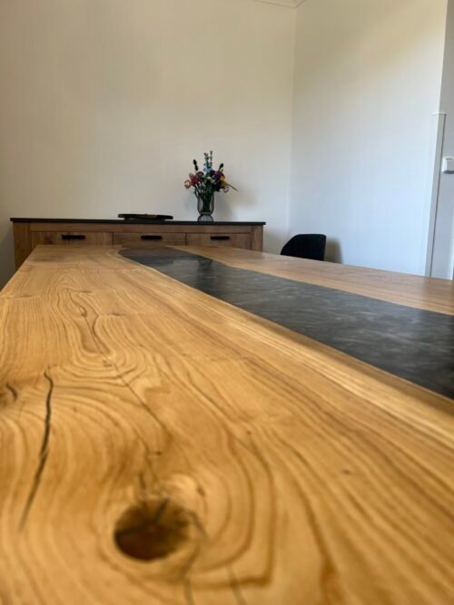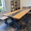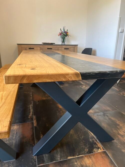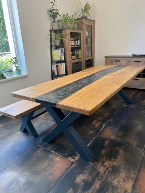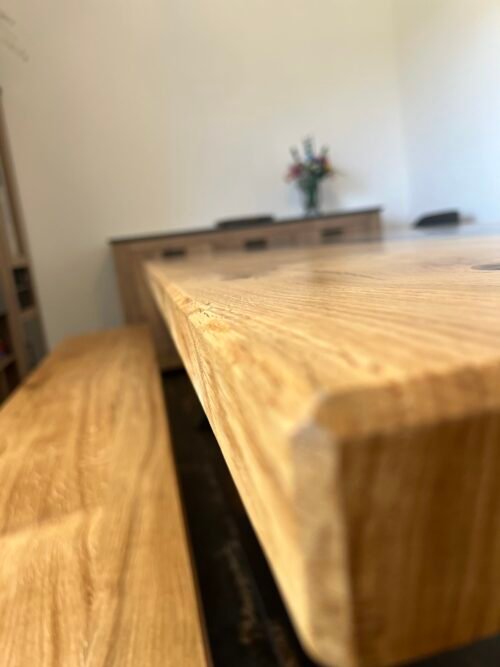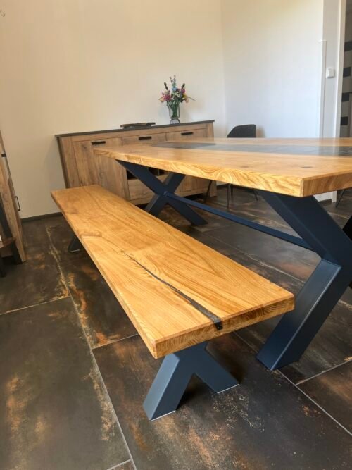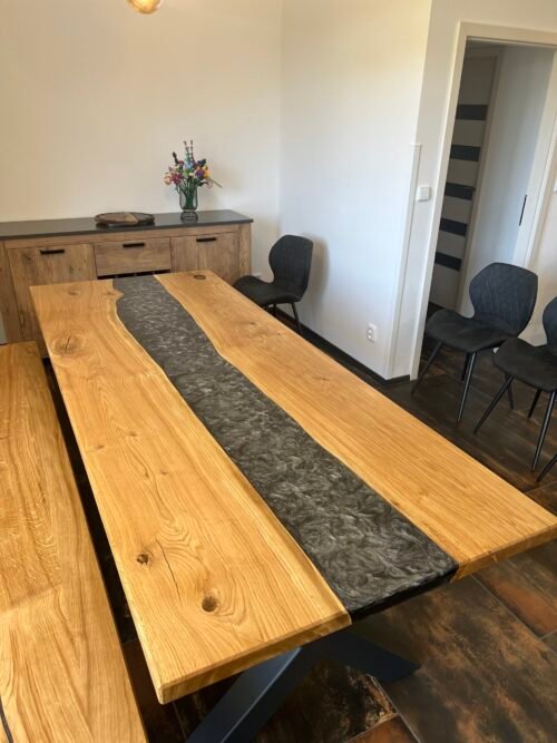 Tento jídelní set zahrnuje robustní dřevěný stůl s lavicí tvoří harmonický celek. Masivní konstrukce a přírodní odstín dřeva dodávají celému setu klasický a nadčasový vzhled. Stůl nabízí dostatek prostoru pro osm osob, což z něj činí ideální volbu pro větší rodiny nebo hosty. Tento set je skvělým doplňkem do každé jídelny, kde vytvoří útulnou atmosféru. Stůl je v kombinaci s epoxidovou pryskyřicí v barvě STONE. Stůl je natřen kvalitním olejem od značky rubio monocoat, který zaručí krásný vzhled a funkčnost po mnoho let.
