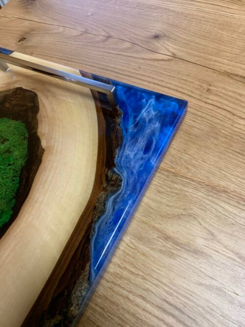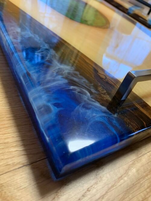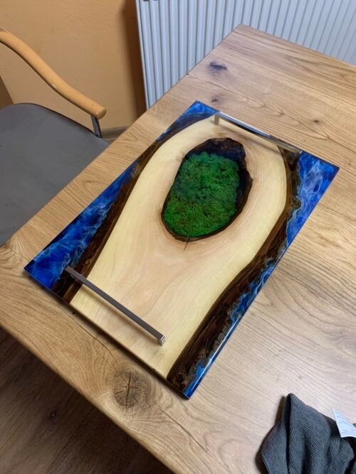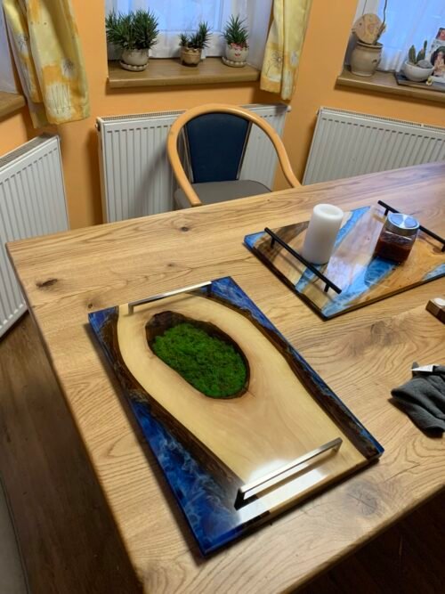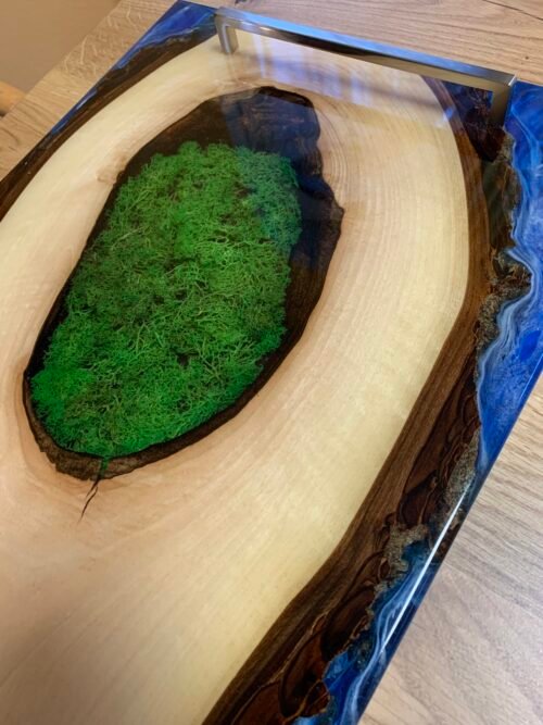 Na fotografii je ručně vyráběné prkénko z ořechového dřeva s epoxidovou pryskyřicí, které vyniká přirozenou kresbou a hladkým povrchem. Jeho odolný materiál zajišťuje dlouhou životnost a snadnou údržbu, což z něj činí ideální doplněk do každé kuchyně. Díky praktickému tvaru je vhodné ke stylovému servírování. Přirozený design prkénka přináší do kuchyně kousek přírody a skvěle doplňuje rustikální i moderní interiér. Tento produkt spojuje funkčnost s estetikou a je dokonalým společníkem pro milovníky kvalitního kuchyňského náčiní.