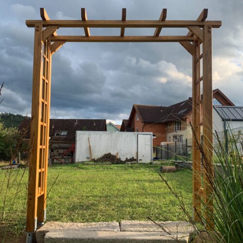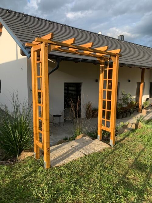 Dřevěná zahradní brána – Brána do vaší oázy klidu 🌿 Dodejte své zahradě eleganci a řád. Tato masivní dřevěná brána s mřížováním je ideální pro pěstování popínavých rostlin, jako jsou růže nebo plaménky. Poctivé řemeslné zpracování a nadčasový design, který vytvoří kouzelný vstup na vaši terasu či zahradu. Každá brána je na míru vyrobená (montážní práce nejsou součástí ceny, pro nacenění nás kontaktujte)